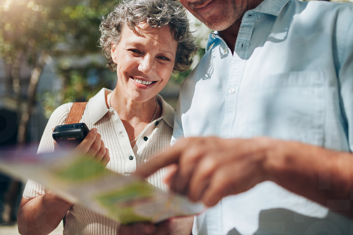 Middle aged couple looking at city map. Happy mature woman with her husband on a summer vacation.