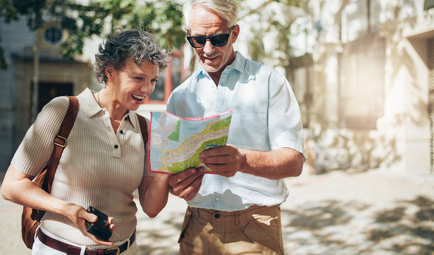 Senior couple of on vacation reading the tourist map. Mature man and woman looking at a map while exploring a city.