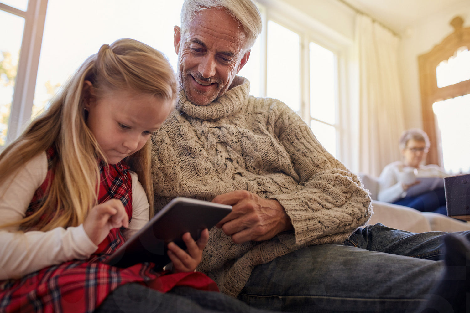 Senior man with granddaughter using digital tablet at home, senior woman sitting on sofa at back.