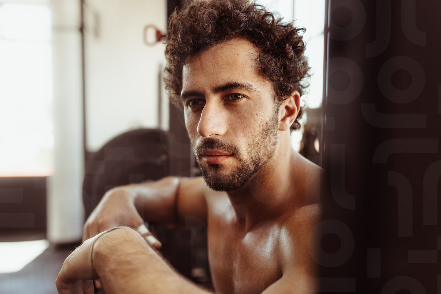 Male taking rest after intense training in gym. Man resting over barbell after training in fitness center.