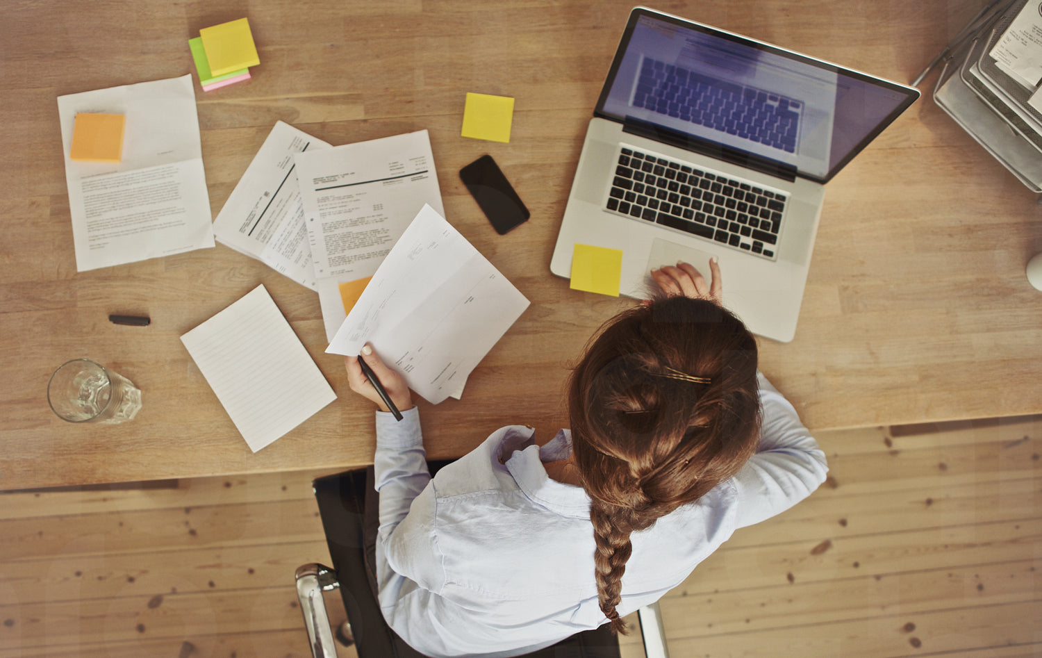 High angle view of an young brunette working at her office desk with documents and laptop. Businesswoman working on paperwork.