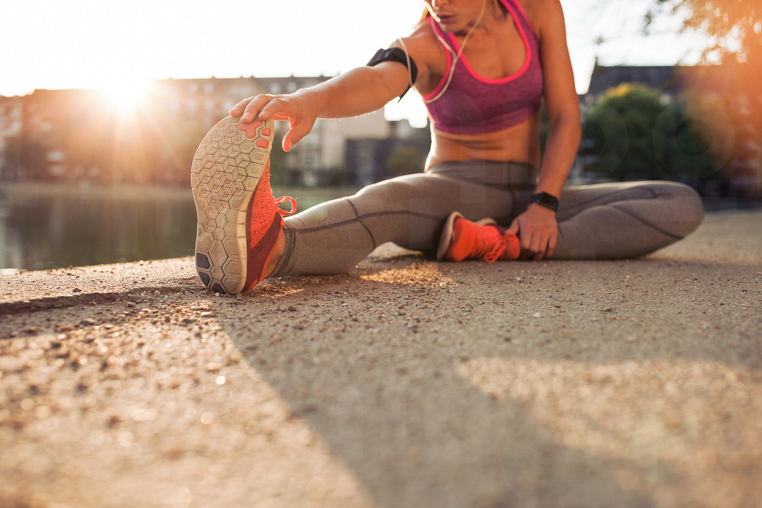 Cropped shot of female runner stretching legs before doing her summer workout. Woman warming up before outdoor workout with sun flare.