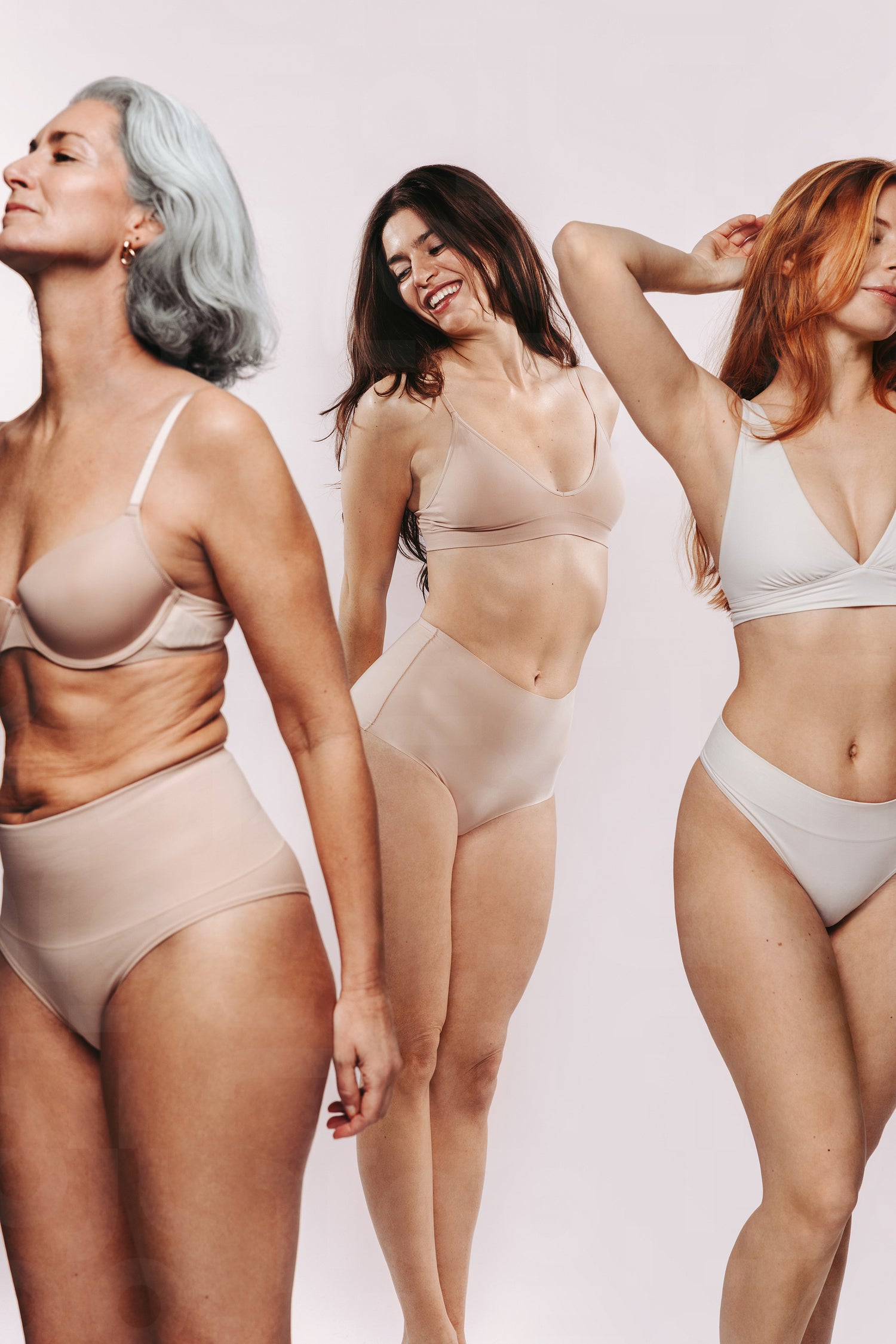Three women of different ages pose and move confidently in studio underwear, smiling and stretching together to convey body positivity, joy and natural confidence in intimate fashion portraits.