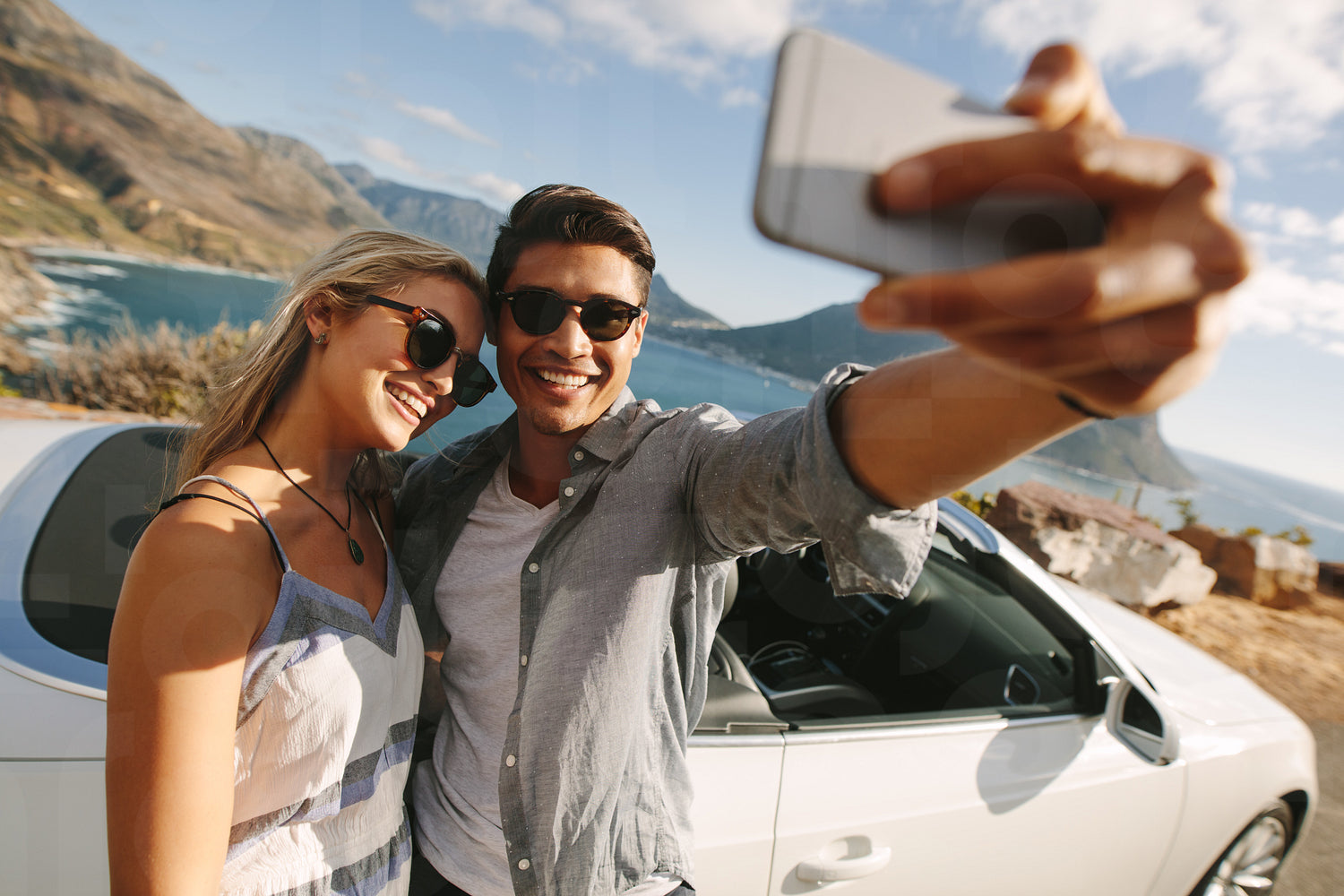 Man taking selfie with his woman on a road trip. Couple standing by their convertible car taking selfie with a cell phone.