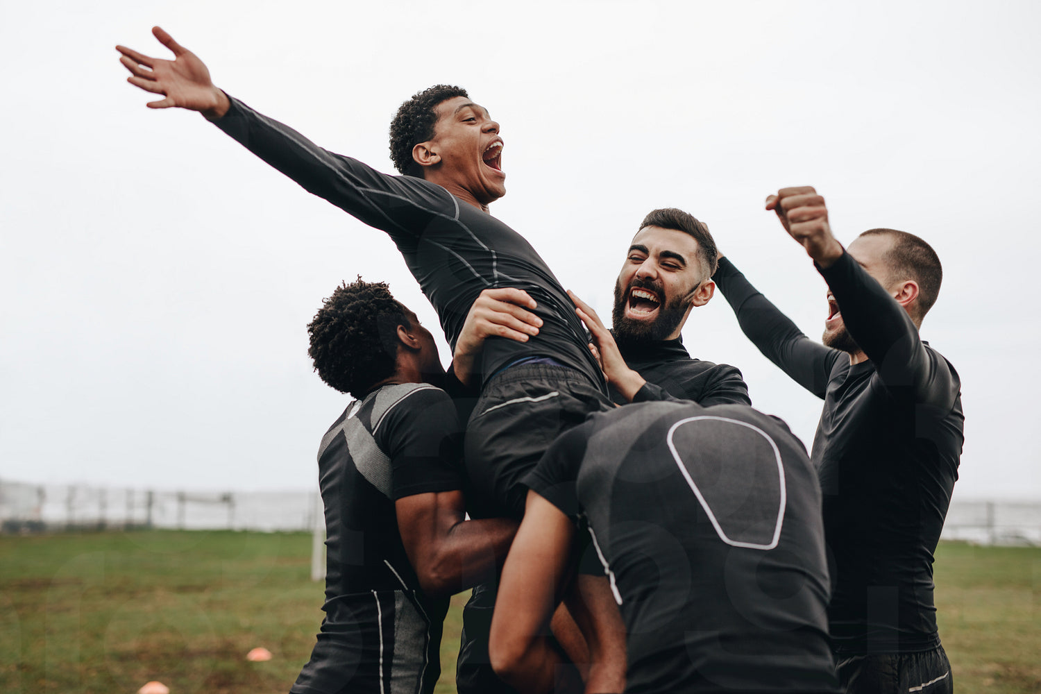 Group of soccer players celebrating a goal standing together on field. Teammates celebrating a goal by lifting a player and shouting in joy.
