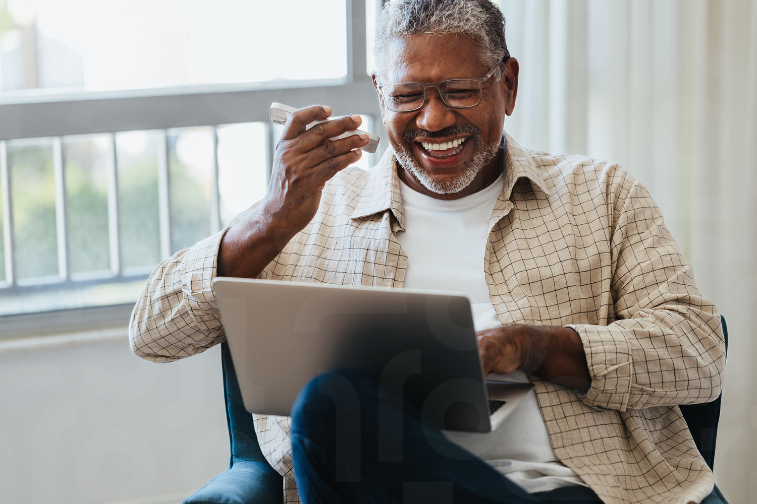 A happy senior man enjoying working online from home, using his laptop and phone for a business task. Joyful and engaged.