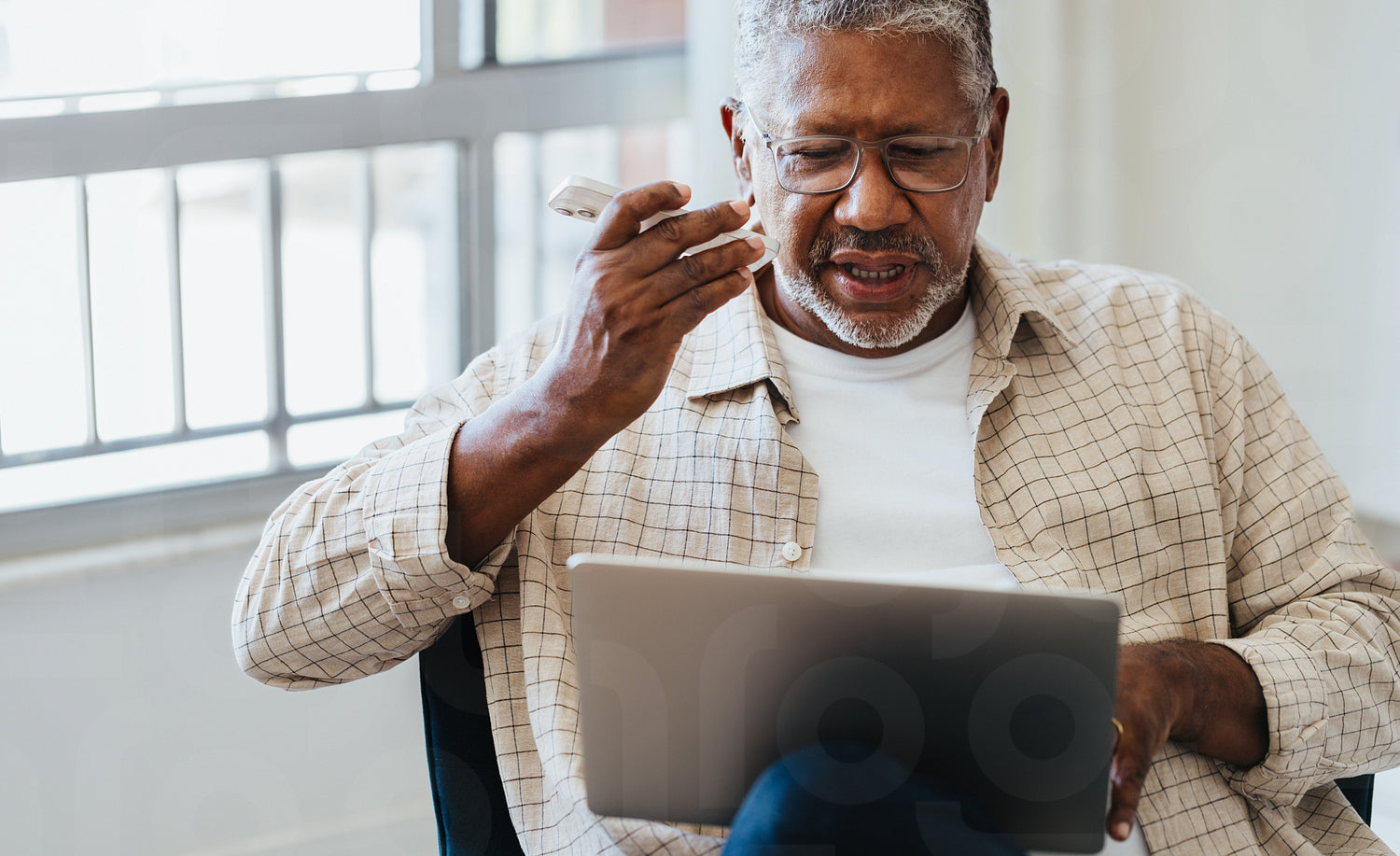Senior man making a phone call while using a laptop, showcasing a connected lifestyle for work or communication.