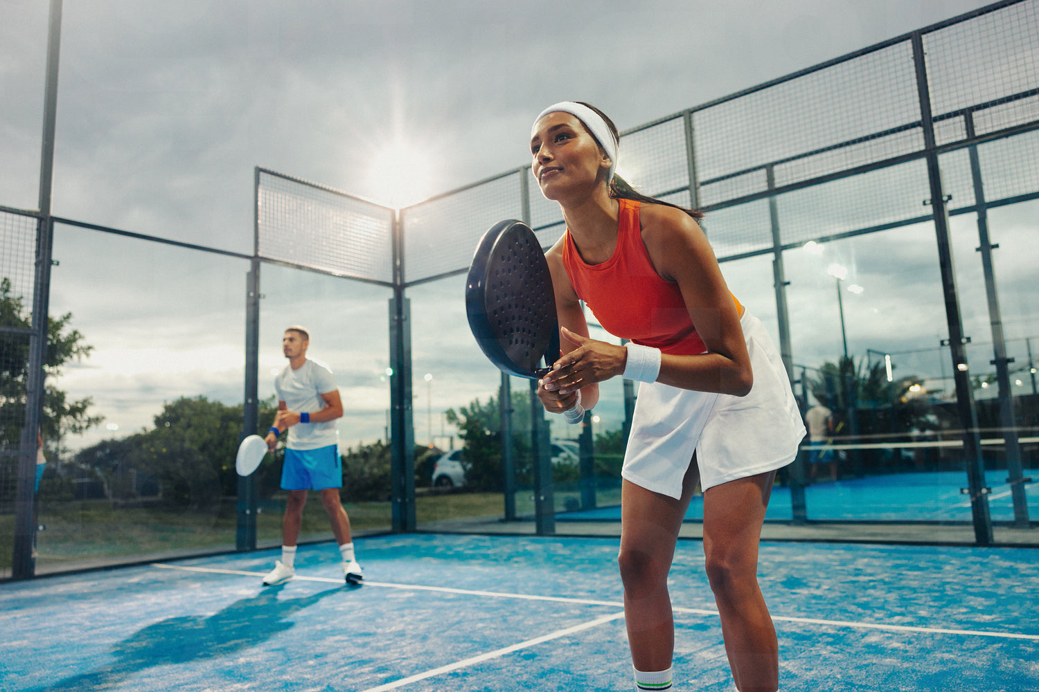Athletic woman stands on a padel court, ready for a competition. She holds her padel racket, prepared for a championship match in the evening. This photo has intentional use of 35mm film grain.