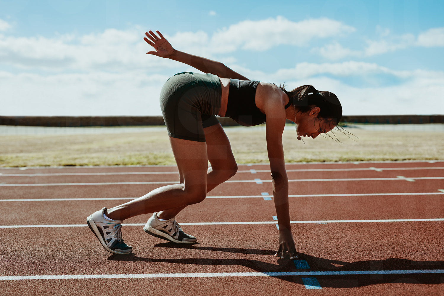 Side view of female runner getting ready at the start line on running track at stadium. Woman athlete taking position on her marks to start off the run.