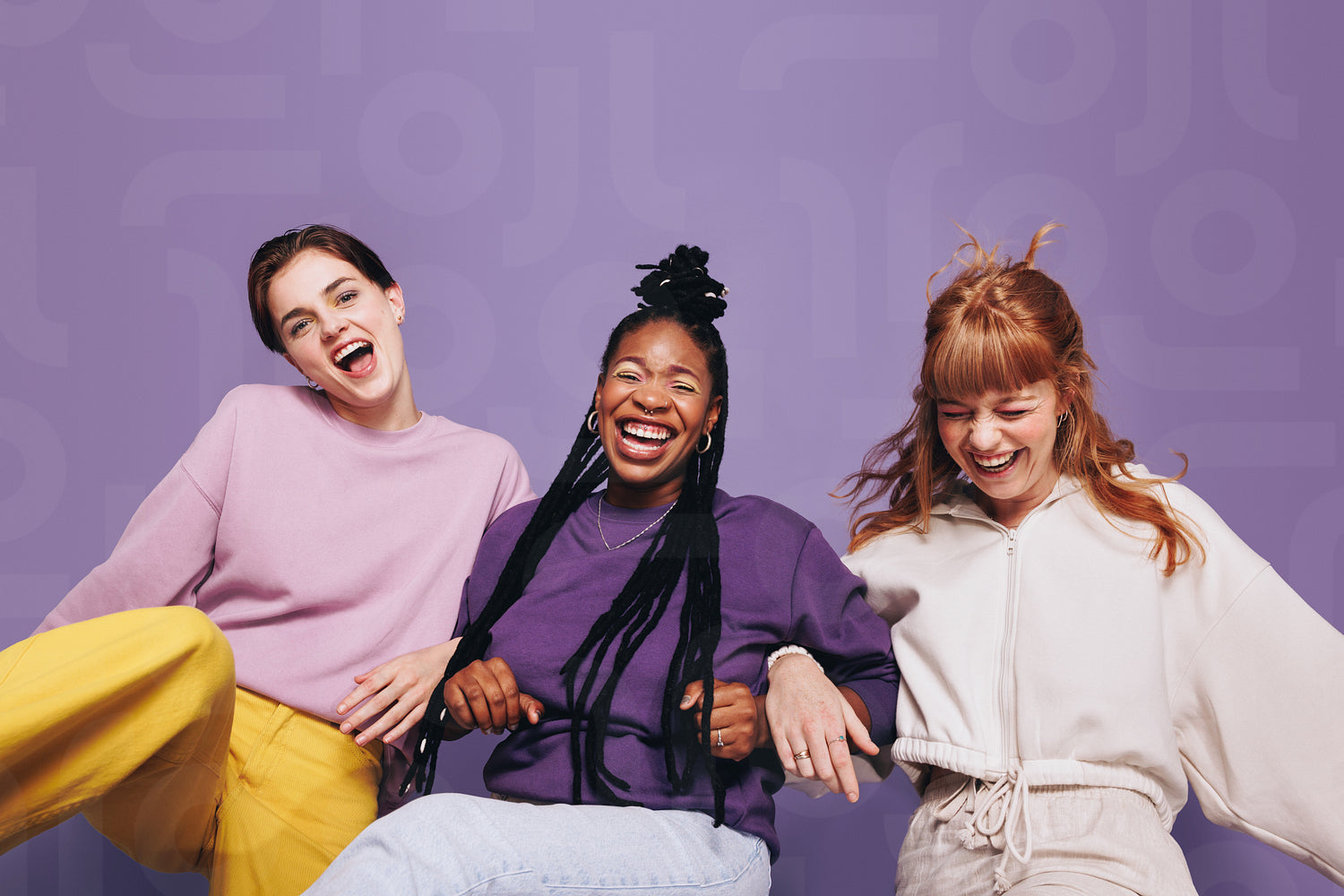 Female friends dancing and having fun in casual clothing. Best friends laughing and enjoying themselves against a purple background. Three young women making happy memories in a studio.