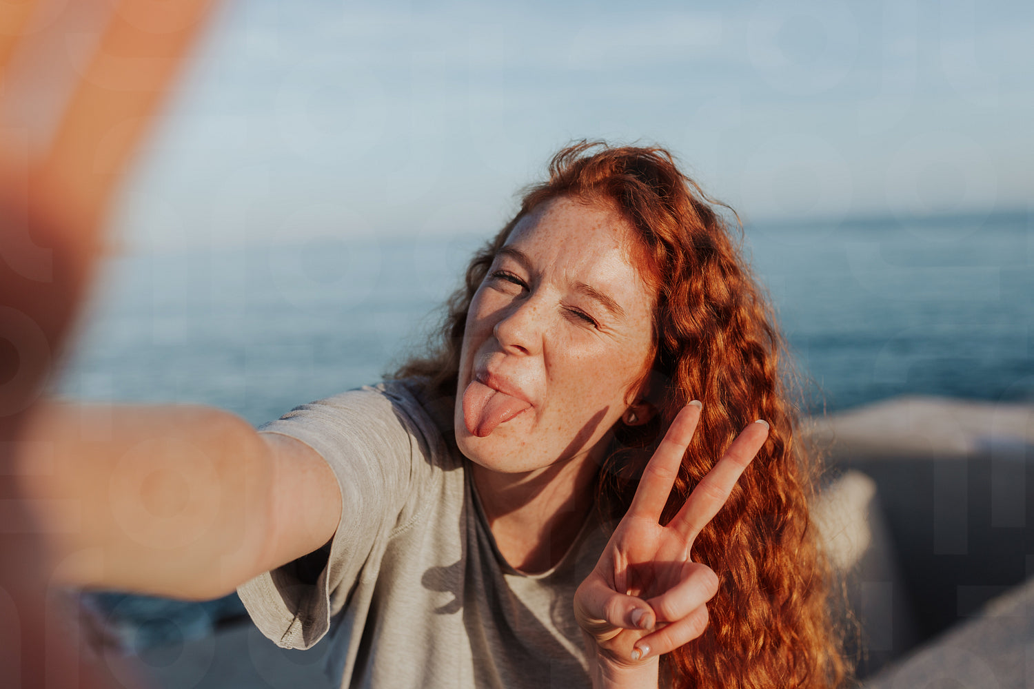 Young woman taking a selfie while standing next to the sea. Fun-loving young woman sticking her tongue out and showing the peace sign. Cheerful young woman having fun in the summer sun.