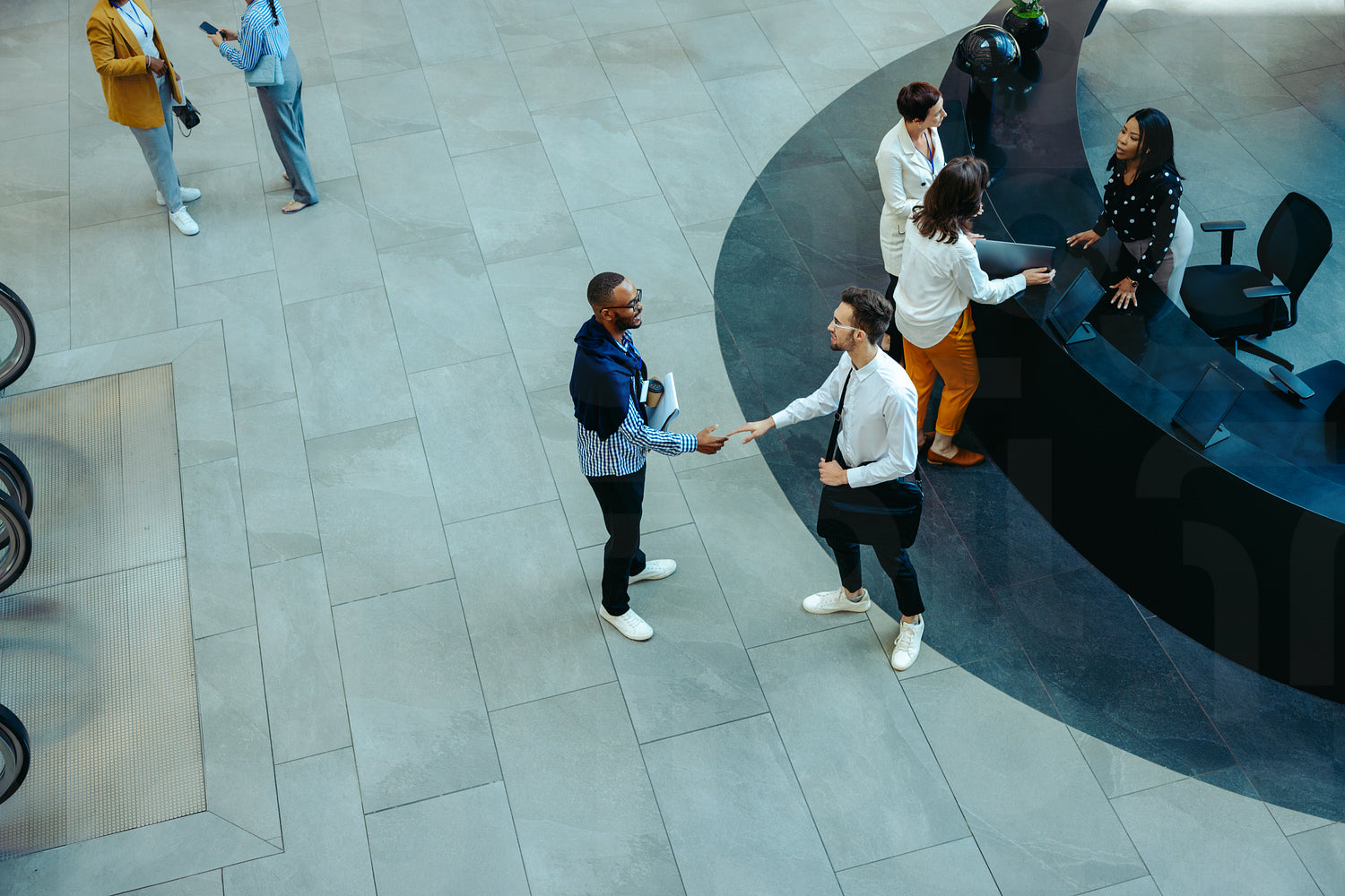 Top view of colleagues shaking hands in a corporate lobby, illustrating professional greeting, teamwork, and career advancement.