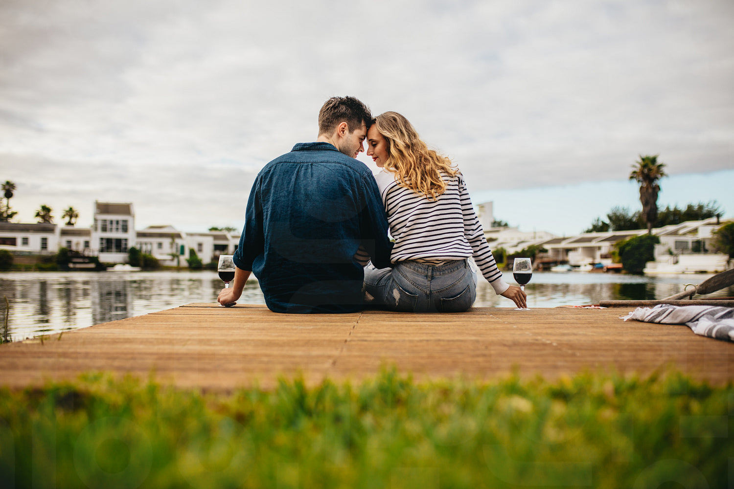 Rear view of a couple in love sitting together touching their heads near a lake. Couple on a day out sitting together holding wine glasses on the wooden dock near a lake.