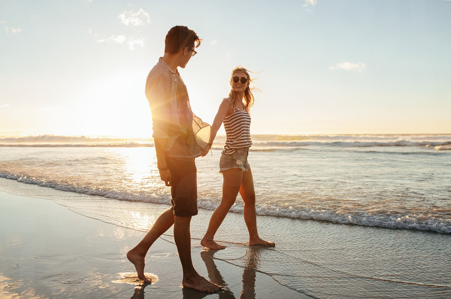 Couple walking on the beach together at sunset