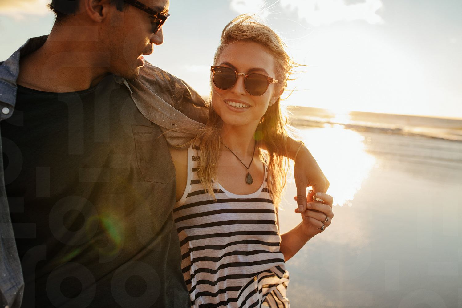 Portrait of woman with boyfriend on beach. Young couple on the sea shore during sunset.