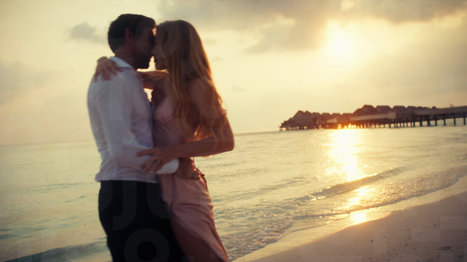 Romantic couple enjoys a luxurious tropical beach vacation. They embrace and share a tender kiss as the sun sets, creating a beautiful and intimate moment by the ocean.