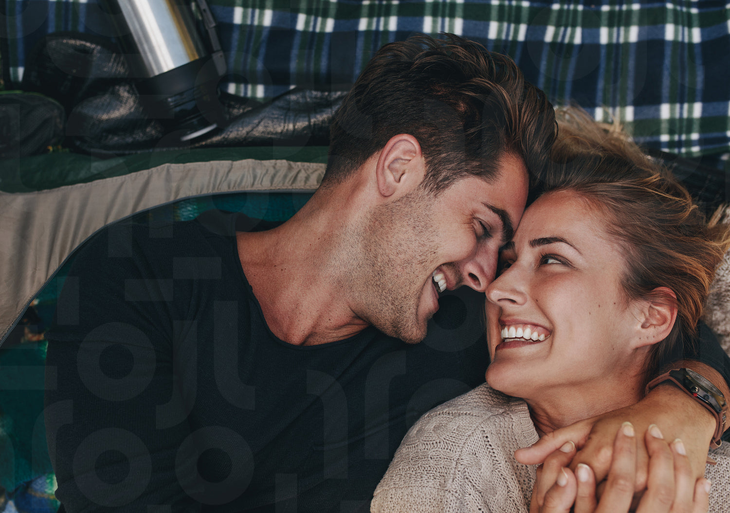 Top view for romantic couple inside a tent. Smiling man and woman lying together and looking at each other in a tent.