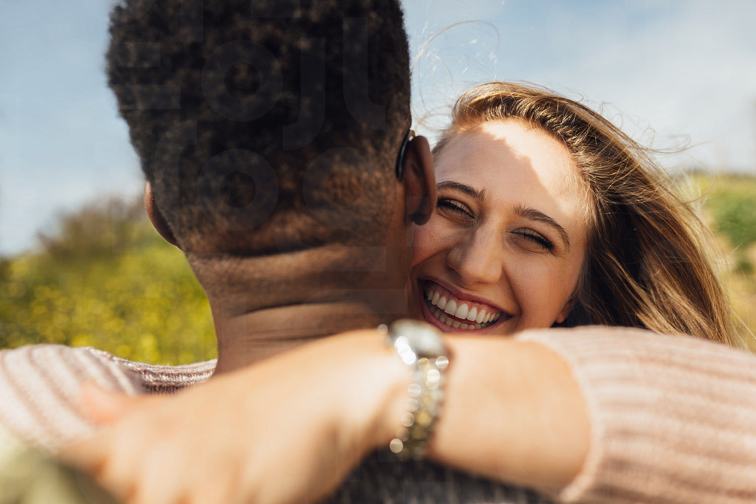 Cheerful woman embracing her boyfriend. Romantic interracial couple outdoors.