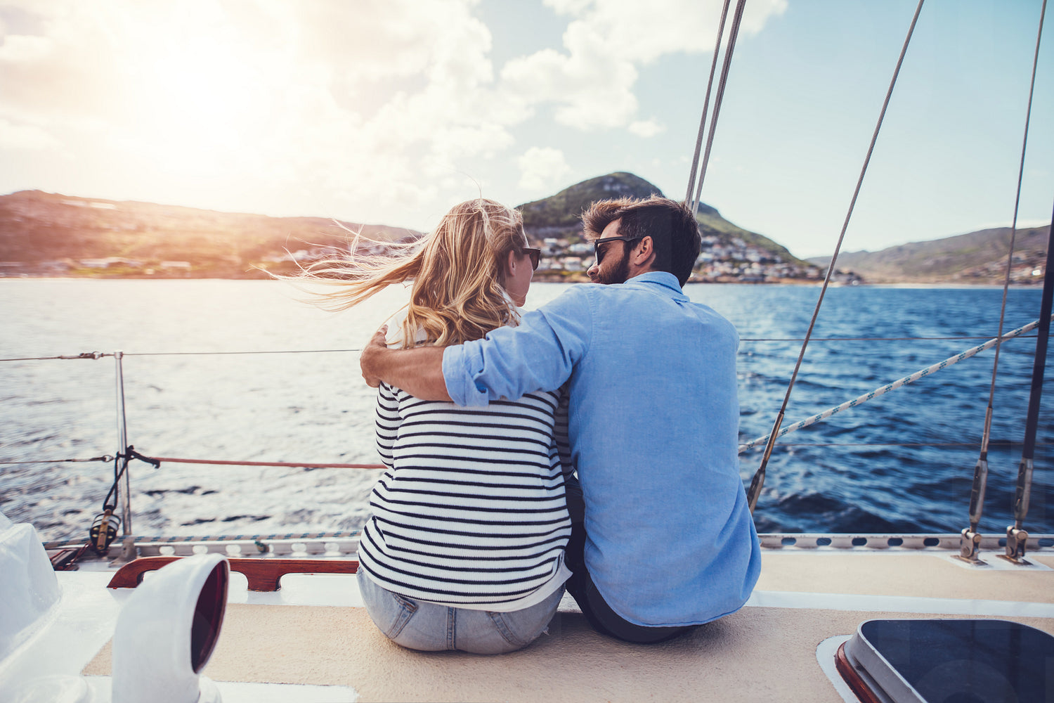 Rear view shot of young couple sitting together on a yacht deck. Romantic couple on a boat trip.
