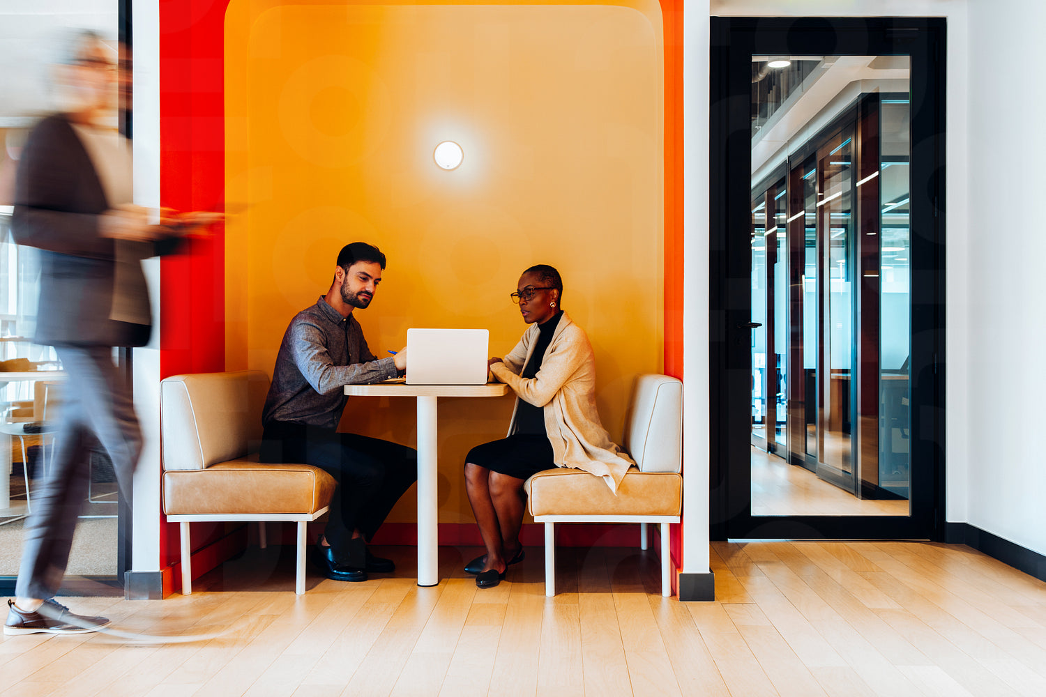 Bright workplace scene with two people sharing ideas in a booth, emphasizing focus and discussion. Another person passes by in the background. An engaging moment of workplace interaction.
