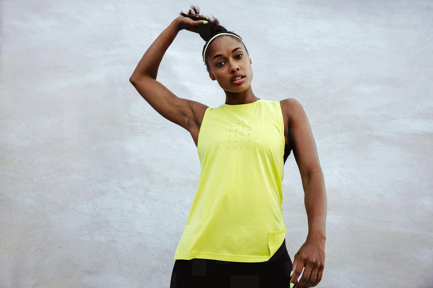 African woman in workout wear holding her hair. Fitness woman standing staring at camera against white background.