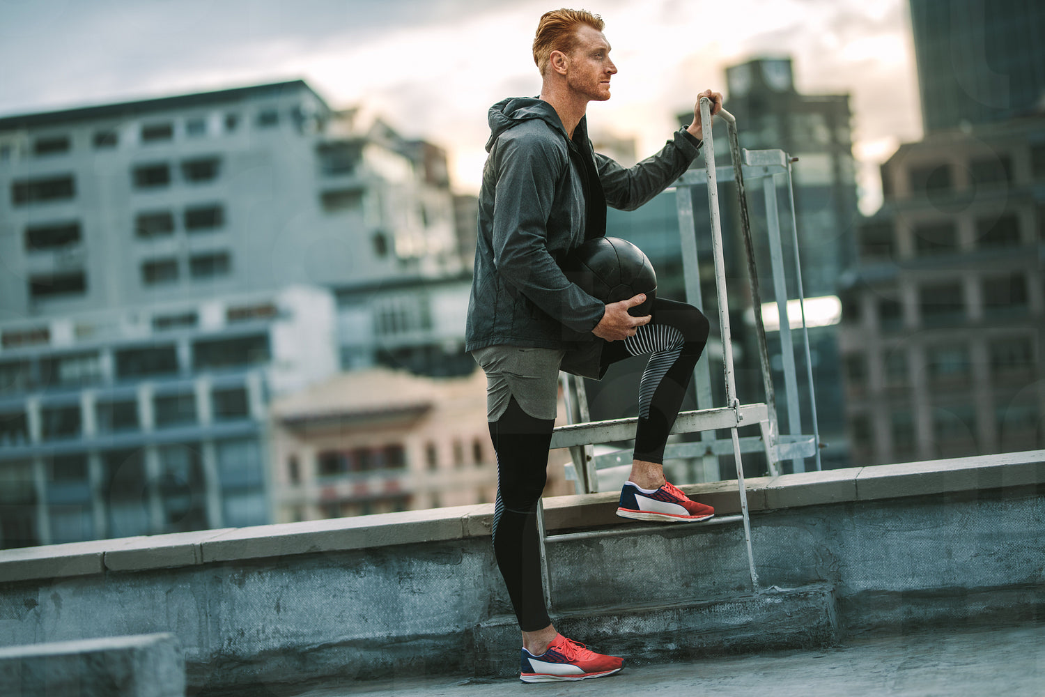 Athlete standing near a rooftop staircase with a medicine ball in hand. Side view of a man in fitness wear standing on rooftop doing fitness training.