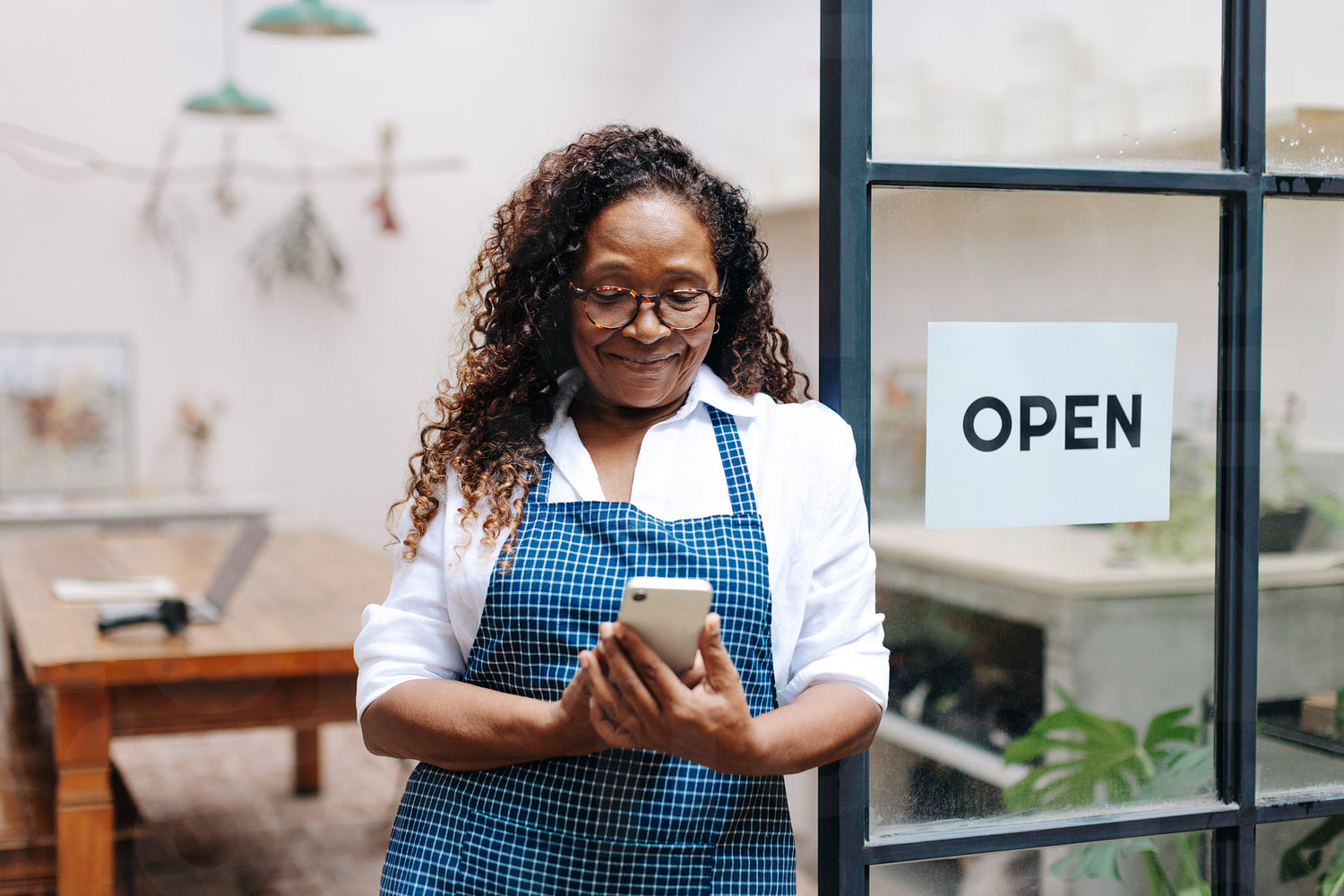 Female small business owner reads online reviews of her flower shop with pride. She knows that her dedication to quality and customer service is reflected in the positive feedback