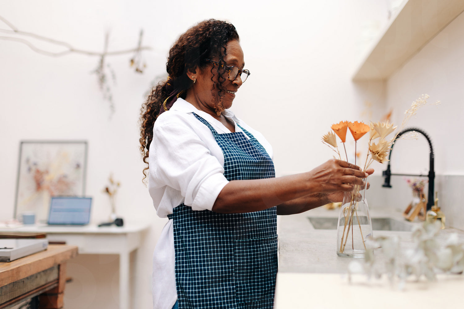 Cheerful mature woman stands in her flower shop, arranging a beautiful black bouquet with dry flowers. Her creative craft and small business brings her happiness as an entrepreneur and self-employed worker.