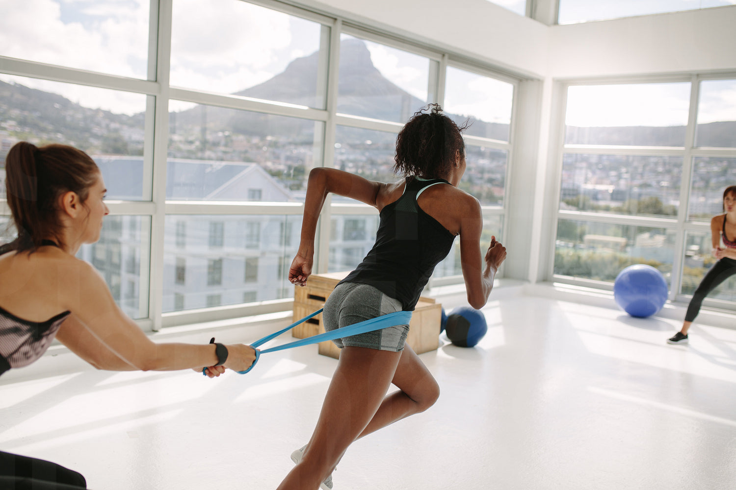 Women at gym during resistance band workout