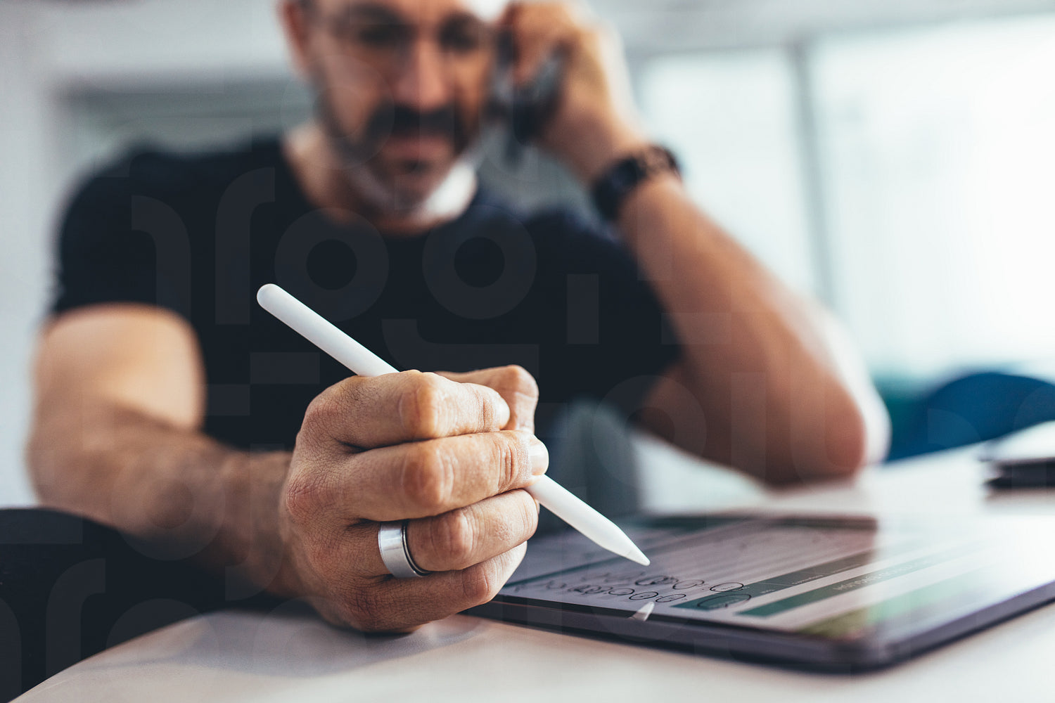 Businessman working on digital tablet and talking on cell phone. Businessman busy working in office , focus on digital tablet and stylus pen.