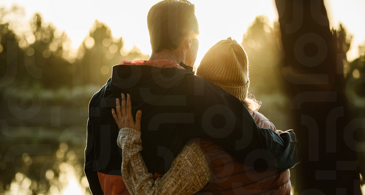 Rear view of couple standing together by the lake. Man and woman in warm clothing looking at a view.