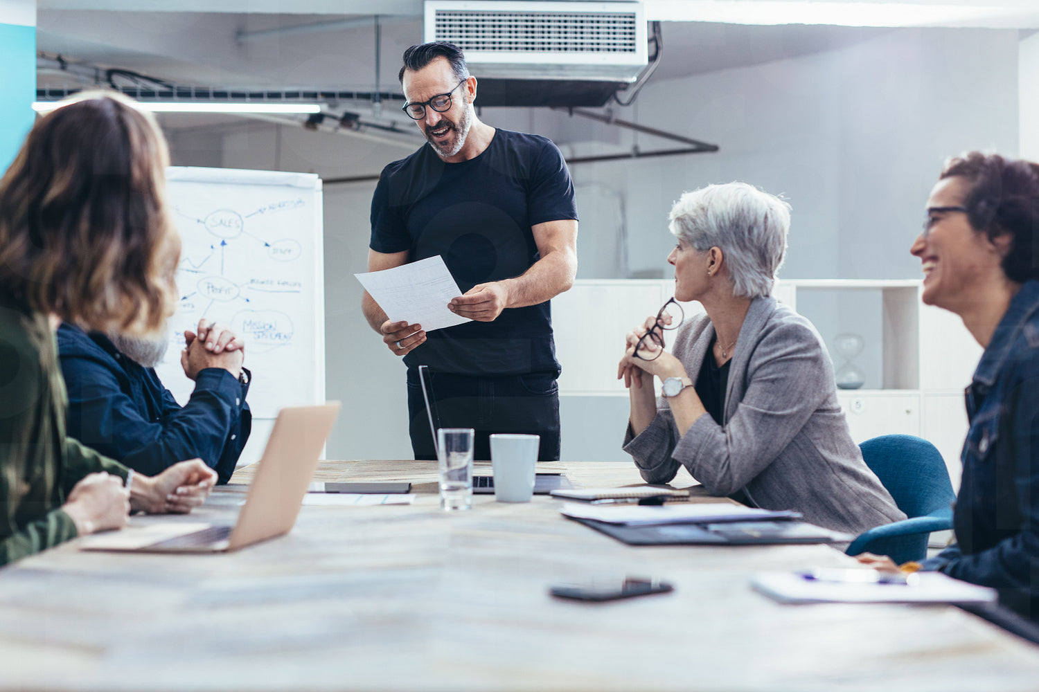 Mature businessman standing and reading a paper to colleagues sitting at a table. Entrepreneur sharing the project details with team in a meeting in conference room.