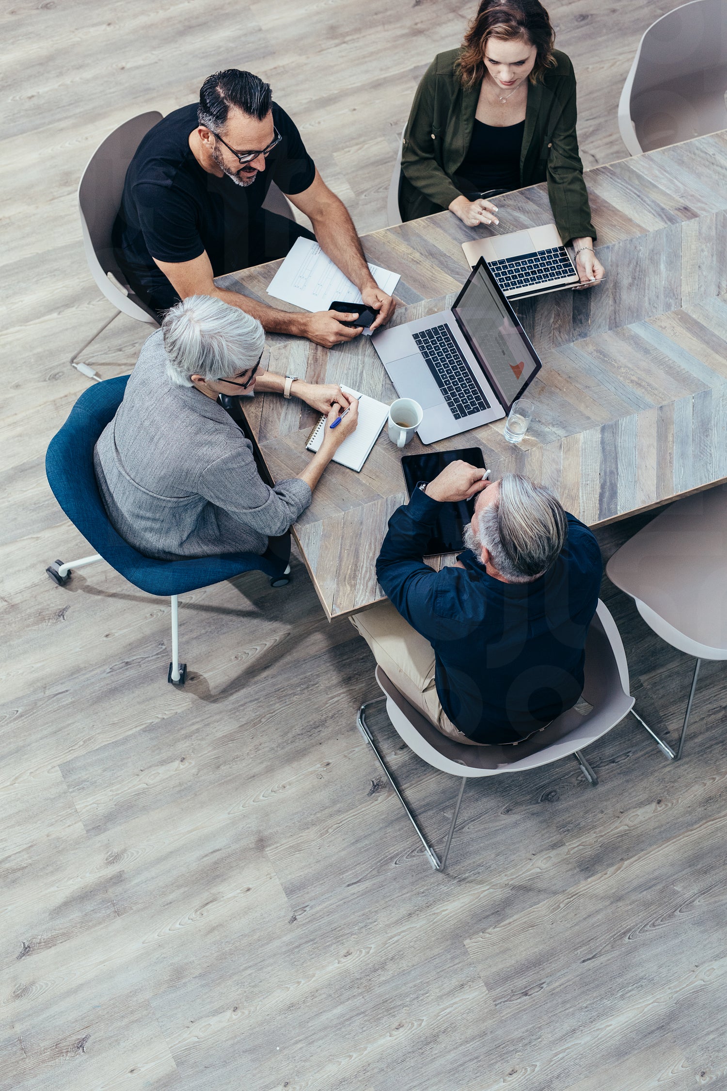 Top view of business team discussing around a table in office. Group of business people having a brainstorming meeting.