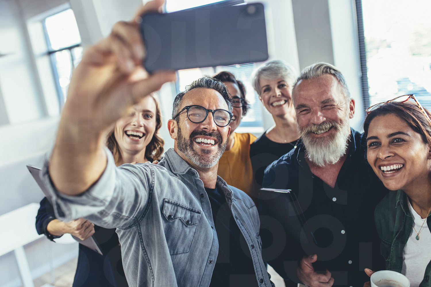 Successful business team taking selfie together. Multiracial group of people taking selfie at office.