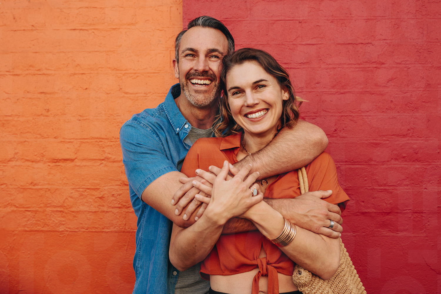 Portrait of affectionate mature couple embracing each other against red and orange background and smiling.