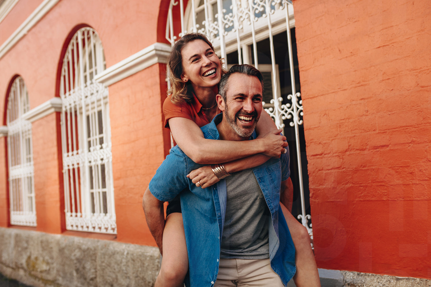 Couple piggybacking outdoors on city street. Man carrying his woman on his back.