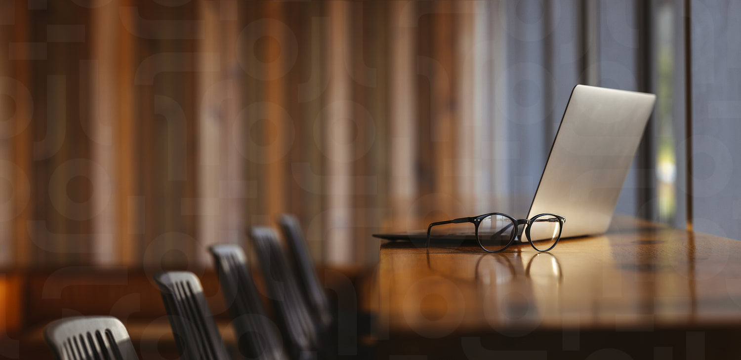 Modern and empty office desk with a laptop, computer, and eyeglasses. Still life shot of a professional working space in a coworking office.