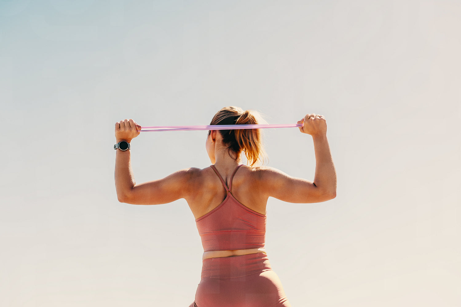 Female in her 30s is embracing her active lifestyle. She is outdoors, wearing sportswear and exercising with an exercise band. She has a keen interest in physical fitness and is stretching and working out in the bright sunlight. This woman is demonstrating her commitment to wellness and wellbeing, as she pursues a healthy and fit lifestyle.