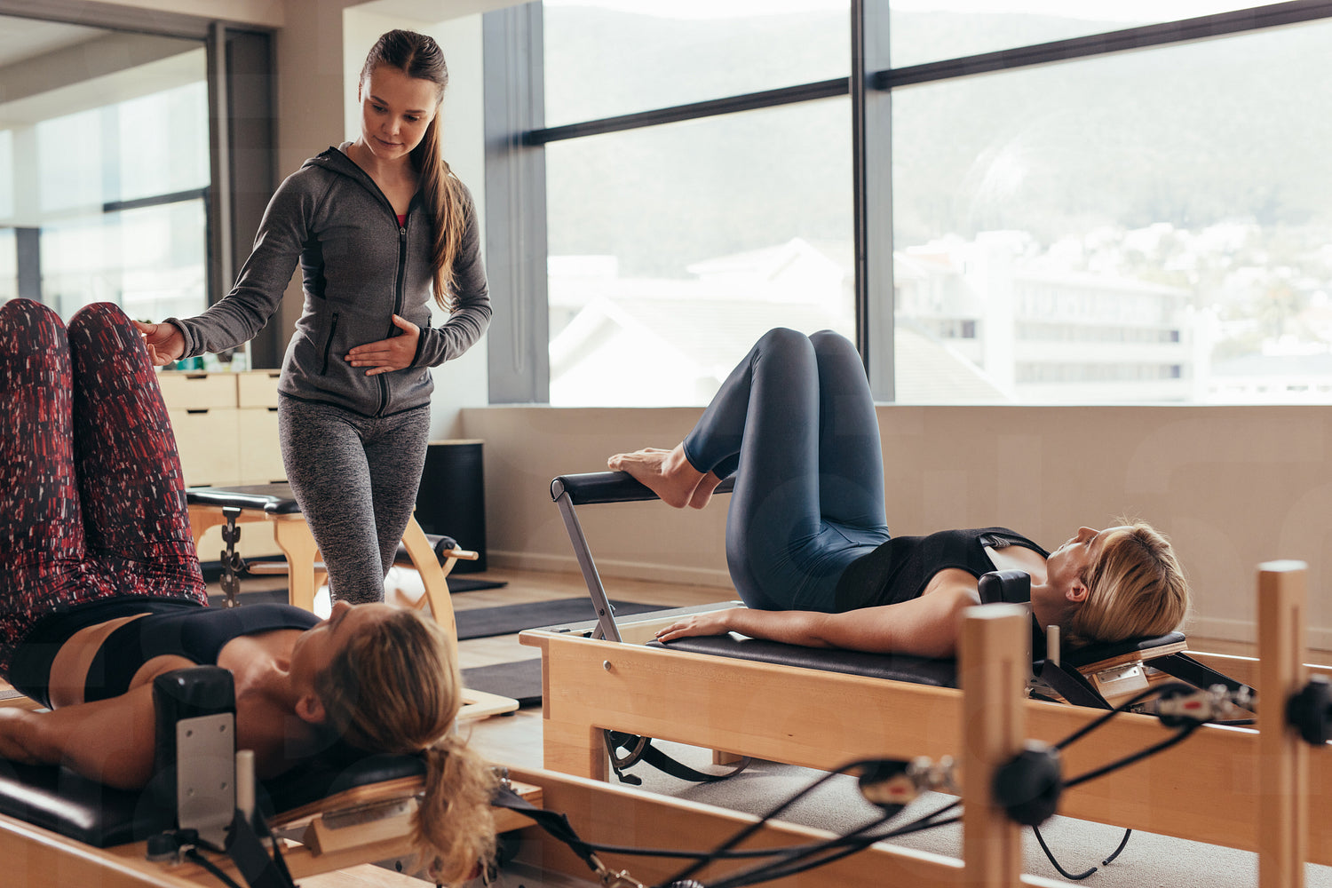 Two fitness women training at a pilates gym. Women doing pilates exercises lying on machines while their trainer guiding them.