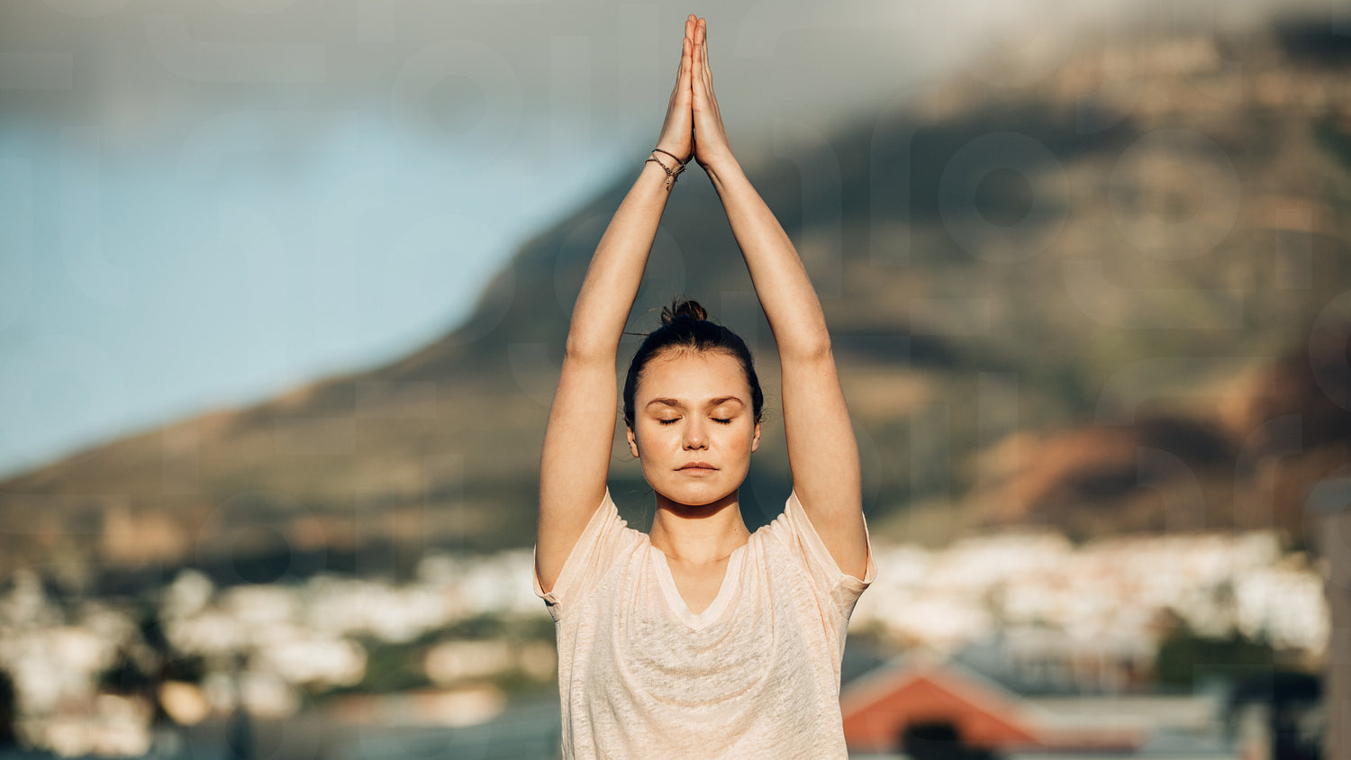 Woman practicing yoga on the terrace of her home. Fitness woman meditating in a yoga posture raising her hands and joining both the palms .