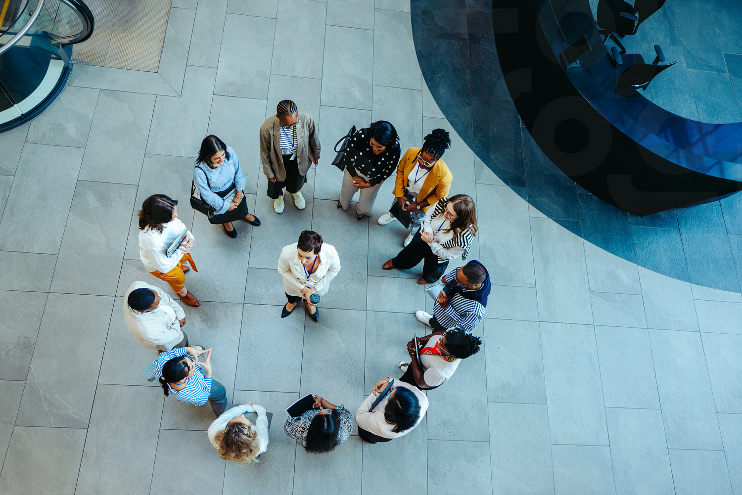 Overhead view of a diverse group of professionals standing in a circle during a corporate meeting. The setting exudes a sense of collaboration, teamwork, and communication among colleagues.