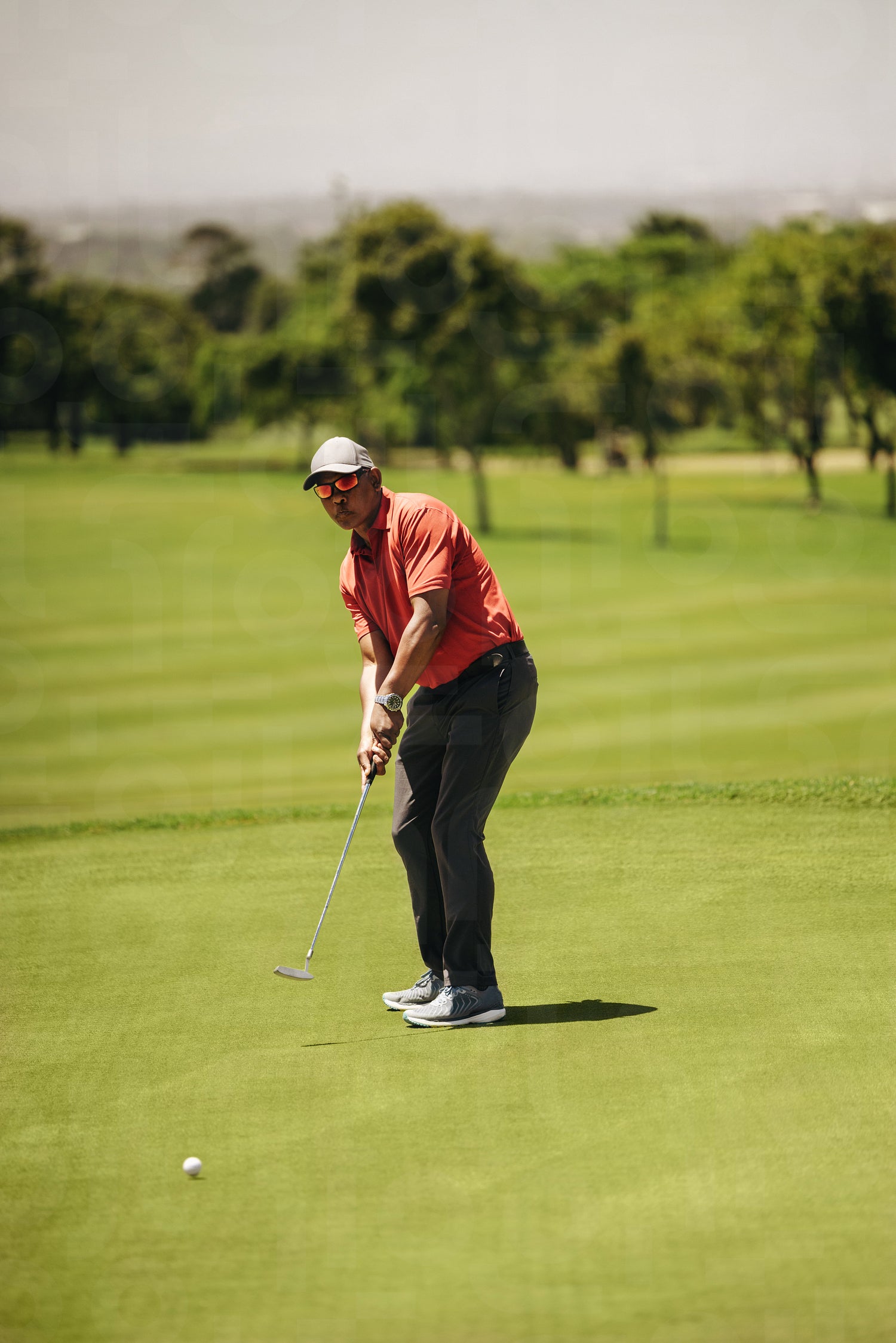 A male golfer is shown putting on a green, exhibiting a focused stance. He aims to achieve the perfect shot io sink the golf ball with precision in a sunny outdoor setting.