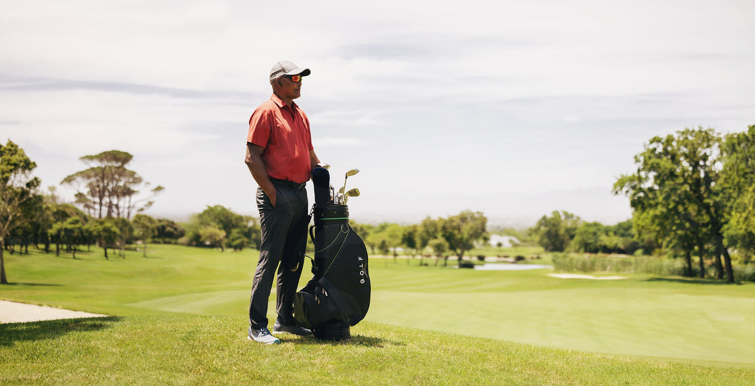 A professional golfer holds a golf bag full of golf clubs stands on a sunny golf course, observing the fairway in stylish golf shoes at a scenic golf resort.