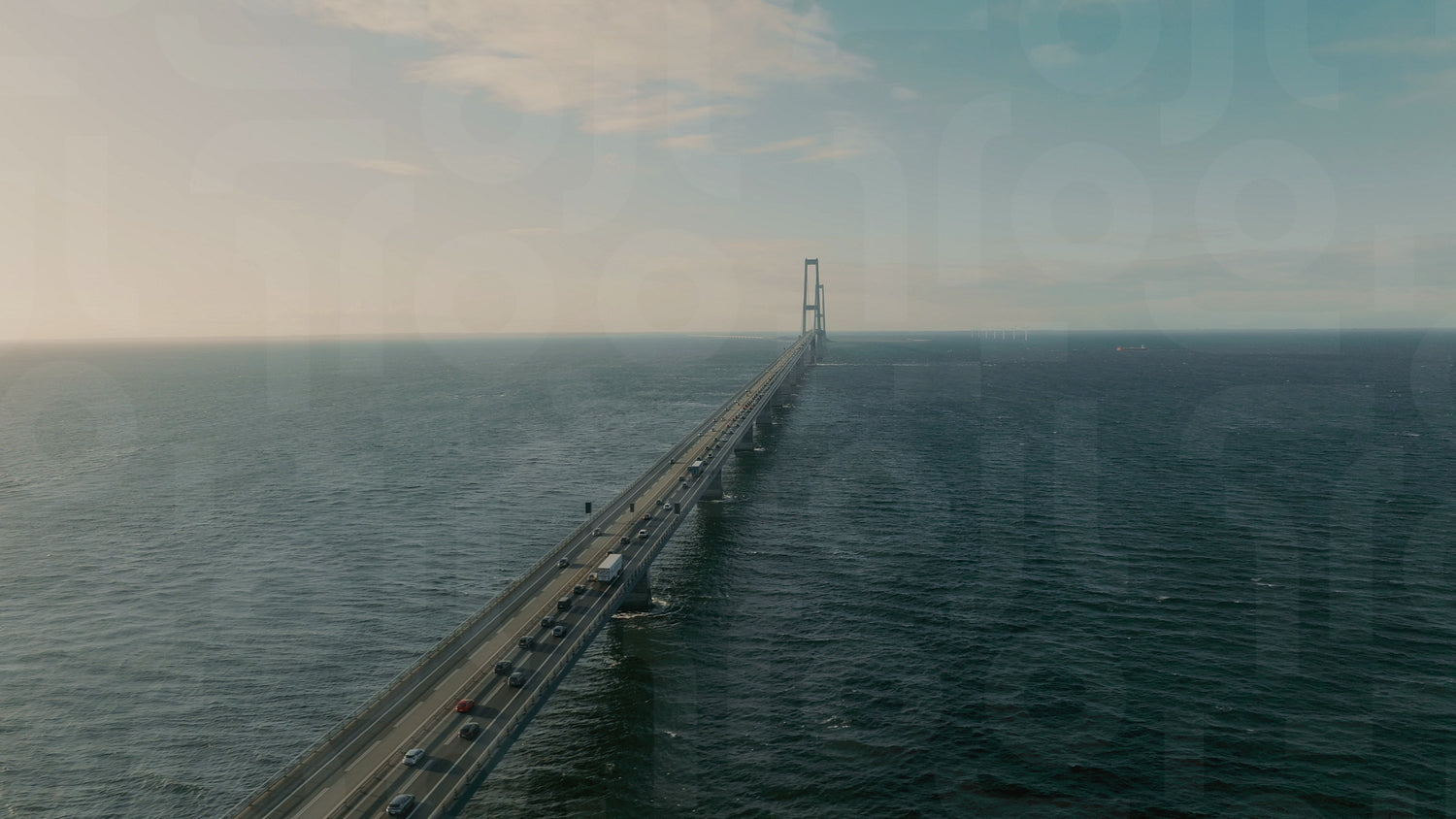 Aerial view of traffic moving across the Storebæltsbroen Bridge in Denmark, travelling from one coast to another at sunset. Majestic scenery of the tall Great Belt structure surrounded by tranquil waters.