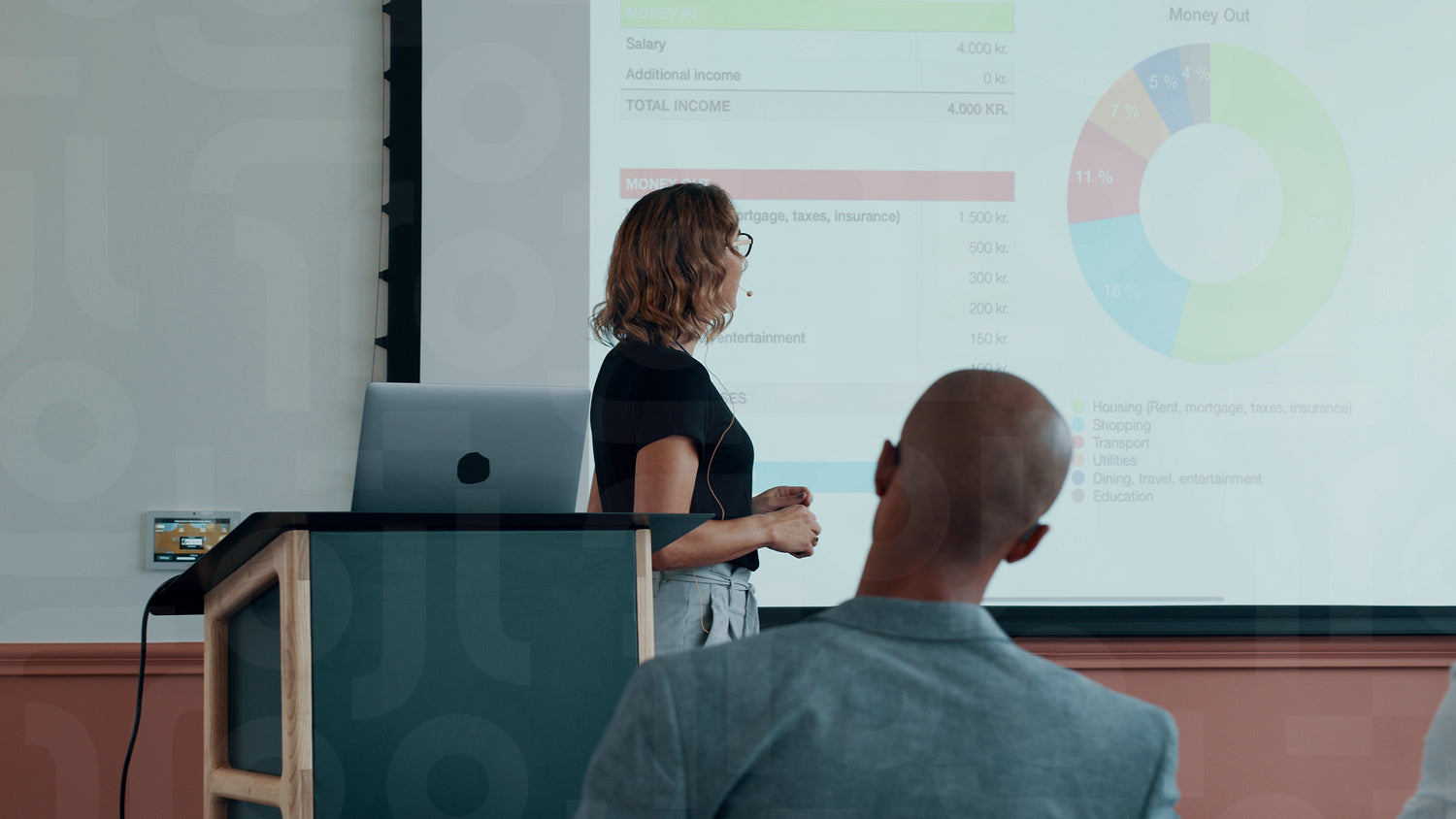 Businesswoman pointing at projection screen and explaining the statistics to the audience. Female speaker giving an informative presentation at conference.