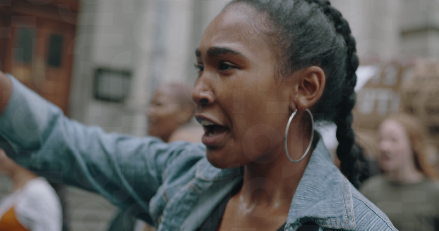 Angry activists marching and protesting in the city. Woman protesting with a group of people on the road.