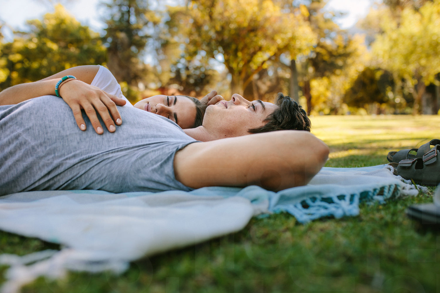 Woman sleeping on arm of her boyfriend in a park on a sunny day. Happy couple lying down on the ground in a park.
