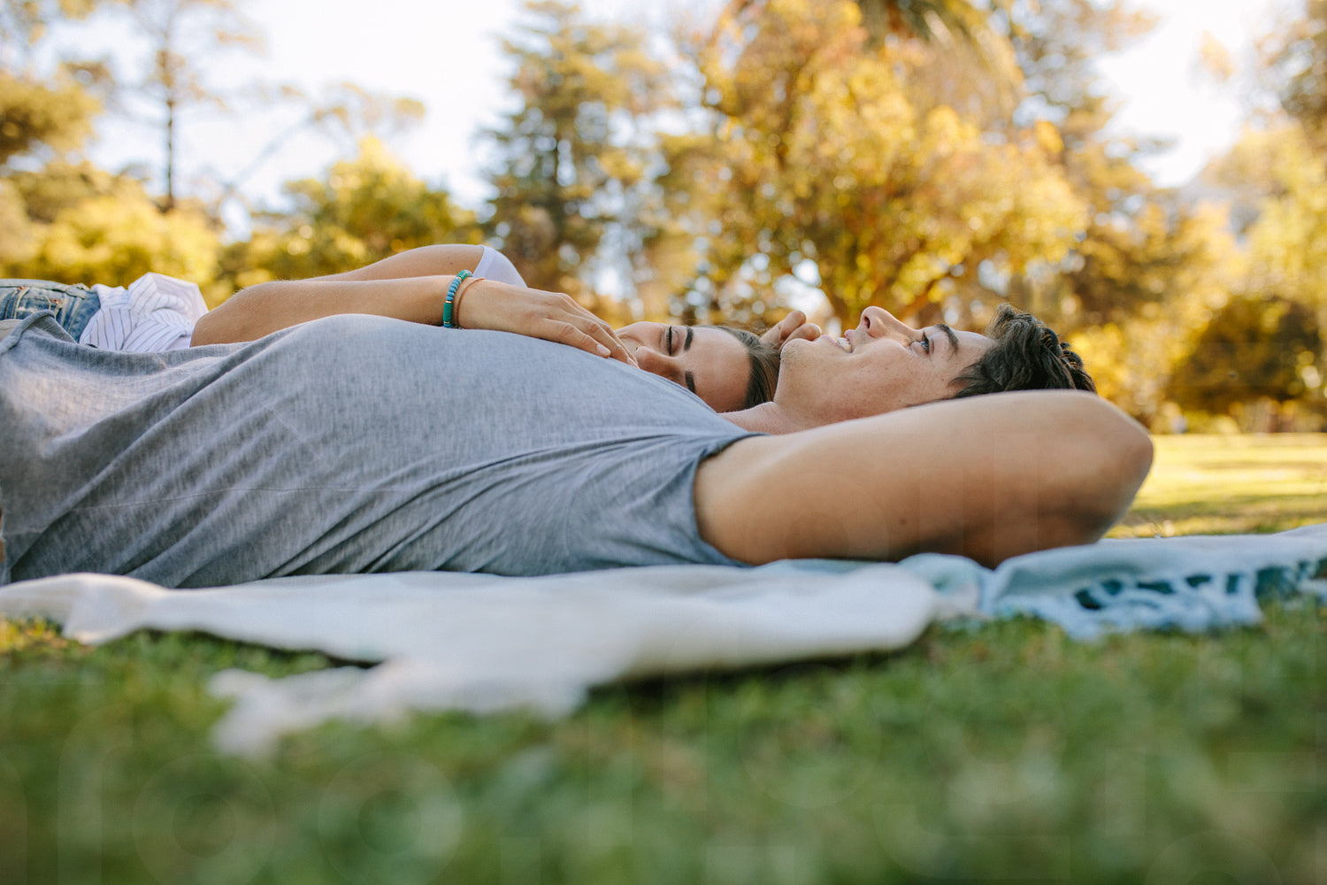 Couple relaxing in a park lying on the ground and talking. Woman sleeping on arm of her boyfriend in a park on a sunny day.
