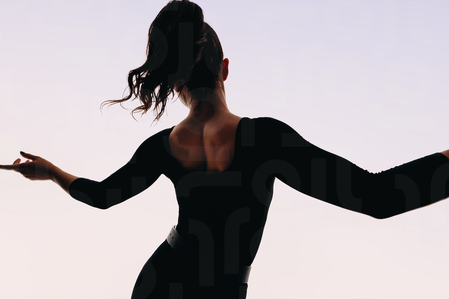 Female dancer with a toned physique and expressive body language performs a dynamic dance with outstretched arms. Woman showcasing flexibility and fluid movements in a white background studio.
