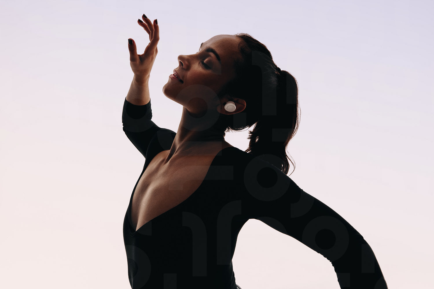 Elegant female performer with a toned physique dances to music with earphones, revealing her flexibility and expressive body language. Woman showing her graceful moves and flowing form in a studio.